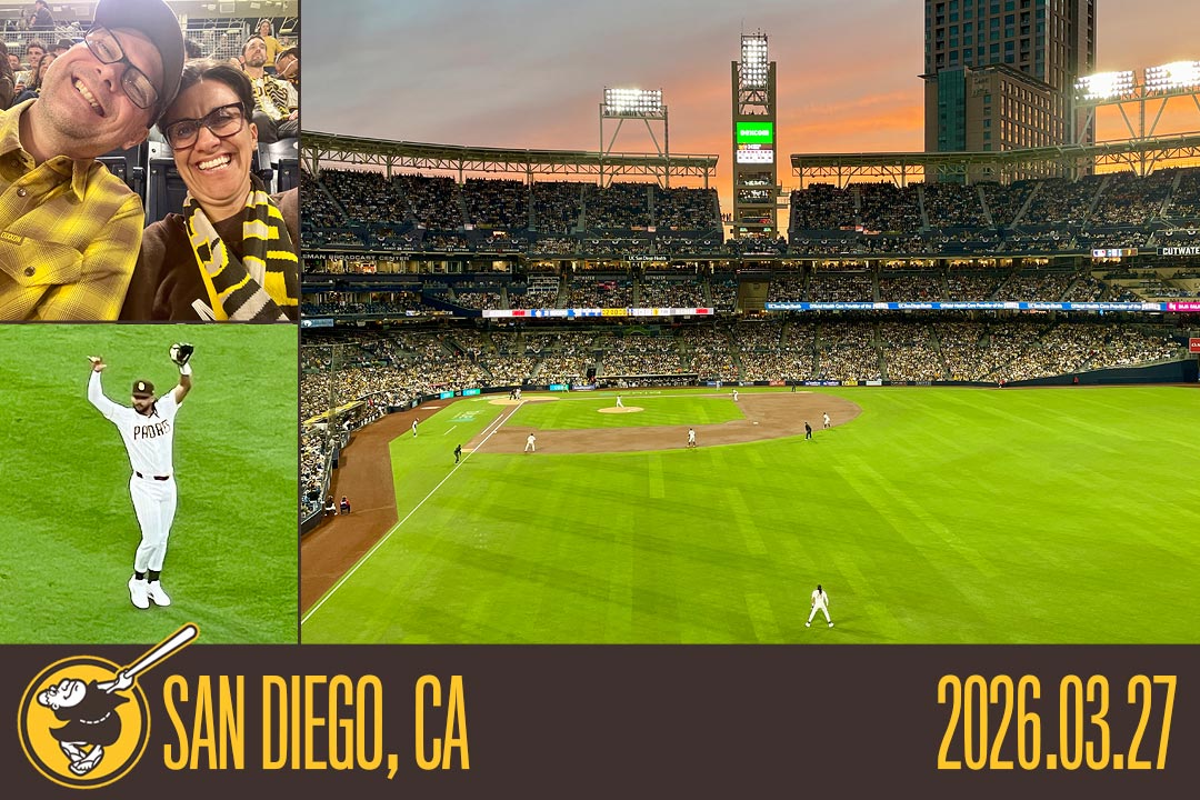 2026-03-27, San Diego. Round 1 of the Padres’ opening series (for us, anyway; Opening Day was the previous game) saw SD’s vaunted bullpen collapse and allow the Tigers and Tarik Skubal to literally walk away with a win (despite a great performance from pitcher Michael King and a homer robbery by Jackson Merrill). We sat out in right field above Fernando Tatis Jr., who was his usual bouncy self.