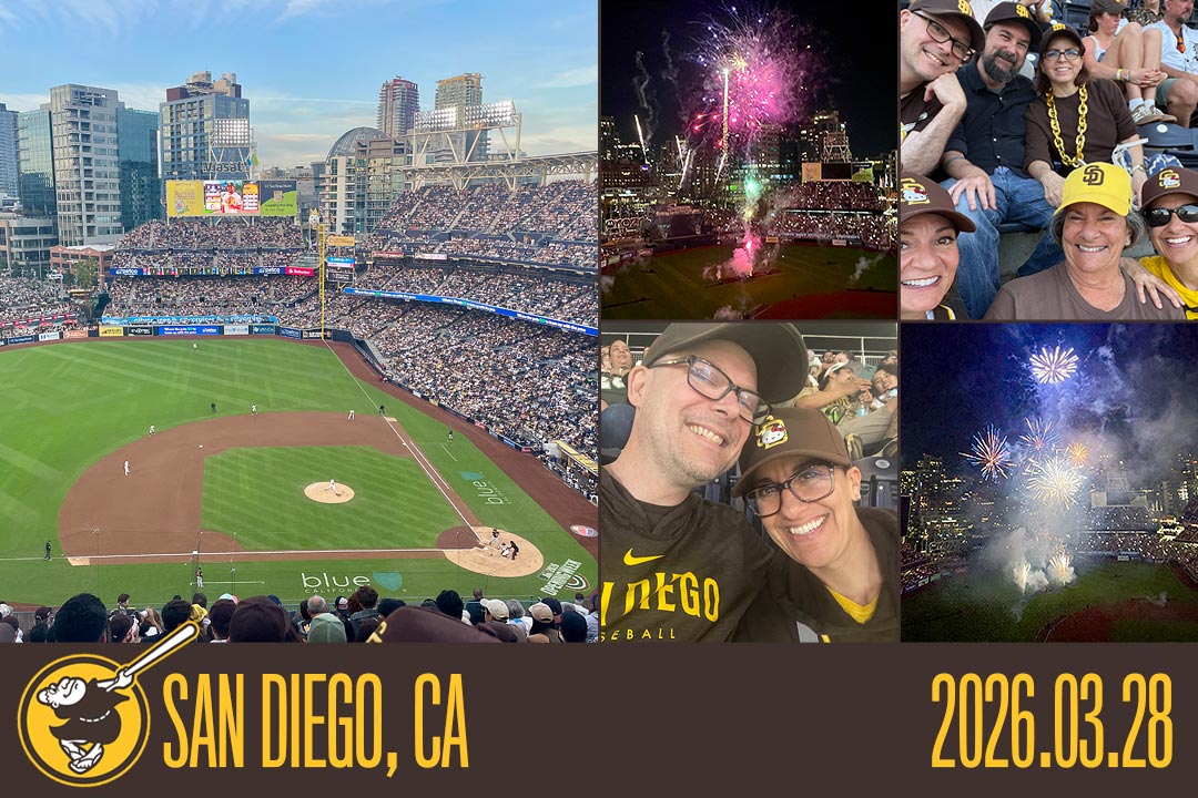 2025-06-24, San Diego. First game of this year’s Petco Park trip saw the Padres beat the Nationals 4-3. Sat in the right-field Crone(nworth) Zone behind Fernando Tatis Jr. Witnessed a Suarez save and a rare Maldonado homer. Also, the Seaside Market banana pudding was excellent.